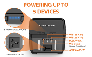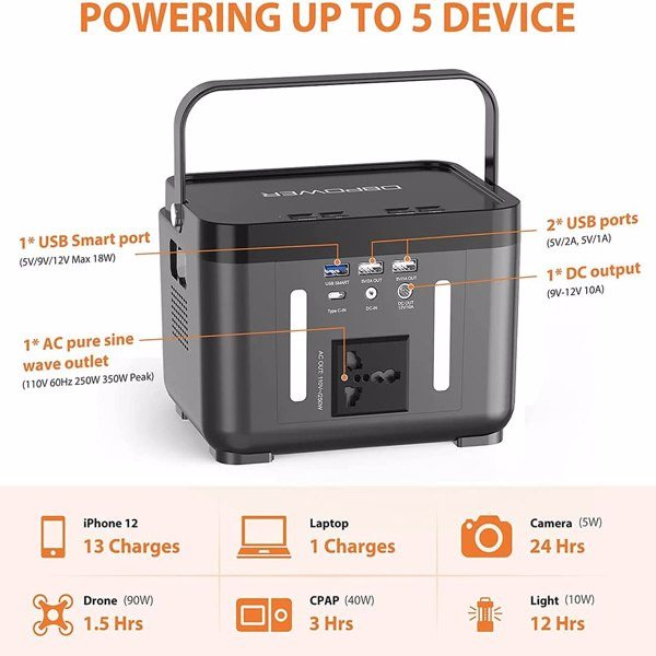 【 POWERING UP TO 5 DEVICES 】 portable power station features with AC/DC/USB outputs: 1* AC outlet (110V 60Hz 250W 350W Peak), 1* DC output (9V-12V 10A), 2* USB ports (5V/2A, 5V/1A), 1* USB Smart port (5V/9V/12V Max 18W) can support quick charge. Our AC pure sine wave outlets can power much equipment such as smartphones, tablets, laptops, cameras, lights, drones, fans, and in-car appliances.