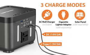 【 3 CHARGE & LIGHT MODES 】 The rechargeable battery backup power supply with 3 charge methods: 110V wall socket, 12V/24V car cigarette socket (sold separately), 15V/2A solar panel (sold separately). No memory effect, no worry about battery capacity reduction. This camping power station featured 3 modes of built-in LED flashlight: lighting, SOS, and strobe are good for emergency use while being outdoors.