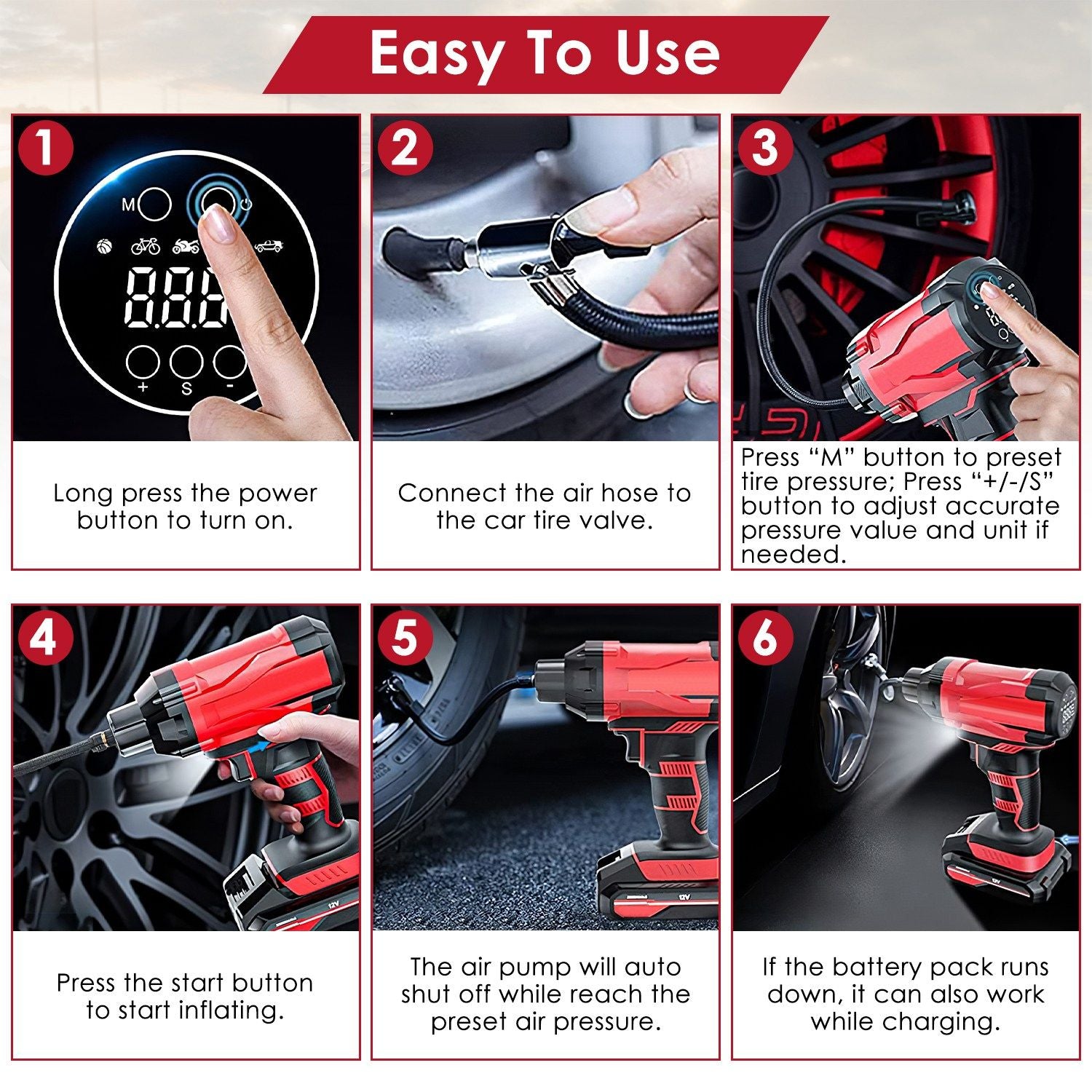 *5 Inflation Modes*:Long press the power button to turn on the machine,short press "M" button to select Basket Ball,Bicycle,Motorcycle,Car,Off-Rode Vehicle then press "S" button to adjust different unit you need,like "PSI","BAR","KPA","Kg /cm²" and press "+/-" to choose accurate pressure value.