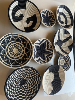 9 wall hanging baskets set for wall decor,9 Black and white shade Rwanda baskets, 9 wall hanging baskets set, 9 color baskets