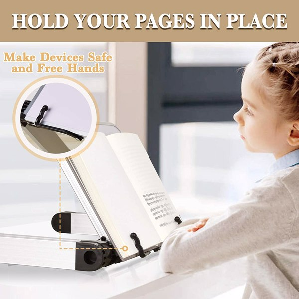 【Book Rest for Reading Hands Free】Made of premium aluminum alloy. Its lightweight design can be taken everywhere for Reading & Working. book stand has 2 flexible and strong paper clips to keep your book widely open. Easy to turn pages while the soft rubber tips prevent damage from paper.