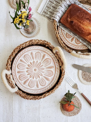 There’s nothing quite like the smell of warm bread on the weekend. Here, our terracotta plate has been engraved with a cute owl on a tree design and cut to fit neatly into a round basket. This special bread warmer is naturally insulating, and the basket itself has been handwoven from sustainably grown seagrass. It’s the best gift item for anyone who loves bread!