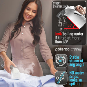 NEWEST 360 ANTISPILL TECHNOLOGY: Innovative steam channeling design & electronic pump system deliver steam evenly from any angle. Unlike ordinary unsafe steamers that simply boil water like an electric kettle and cannot be tiled over 45 degrees, Polardo can be used even upside down, effectively preventing water spitting & leaks. The handheld garment steamer body always stays cool on the outside & can be put on any surface. Enjoy safe and dry ironing without the risk of burns and water spills. POWERFUL / ULTRA FAST HEAT UP / HIGH CAPACITY: The most powerful and top rated clothing ironing steamer on the market. The easy-to-fill water tank heats up in less than 25 seconds and powers 10 continuous minutes of effortless steaming. Unlike other models, if paused, the device starts working immediately after turned back on, saving your precious time. PORTABLE / LIGHT WEIGHT / TRAVEL SIZED: Look sharp on your business trips and family vacations. The Polardo mini iron steamer is powerful enough to get rid of even the smallest wrinkles, but compact enough to fit in your backpack. Being feather light, it is as powerful as a full-sized steamer. Includes a luxurious traveling bag for easy packing. The steamer also features an extended ultra long cord for added convenience. 8-IN-1 / IDEAL FOR ANY FABRICS / FREE ACCESSORY ADDED Take steaming to the next level with the 8-in-1 Polardo steamer iron. Steam, remove wrinkles, soften, defrost and clean any type of fabric. Use it on wool, cotton, satin, linen, nylon blends, sequins, embroidery, beads, and more. It is gentle and safe to use on the most delicate fabrics. Simply attach the BONUS GIFT to treat your delicates, including lace, silk and lace, to the same multi-action wrinkle-busting results!