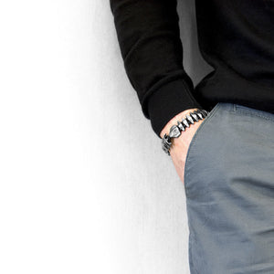 The Coal Black Delta Anchor Maxi Silver and Braided Leather Bracelet was both designed and skilfully handcrafted completely in Great Britain. Combining British craft manufacturing with a discerning modern-minimalist style, this ANCHOR & CREW bracelet features: