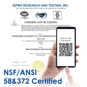 System is tested and certified by IAPMO R&T against NSF/ANSI Standard 58 for the reduction of TDS, and against NSF/ANSI 372 (≤0.25% lead).