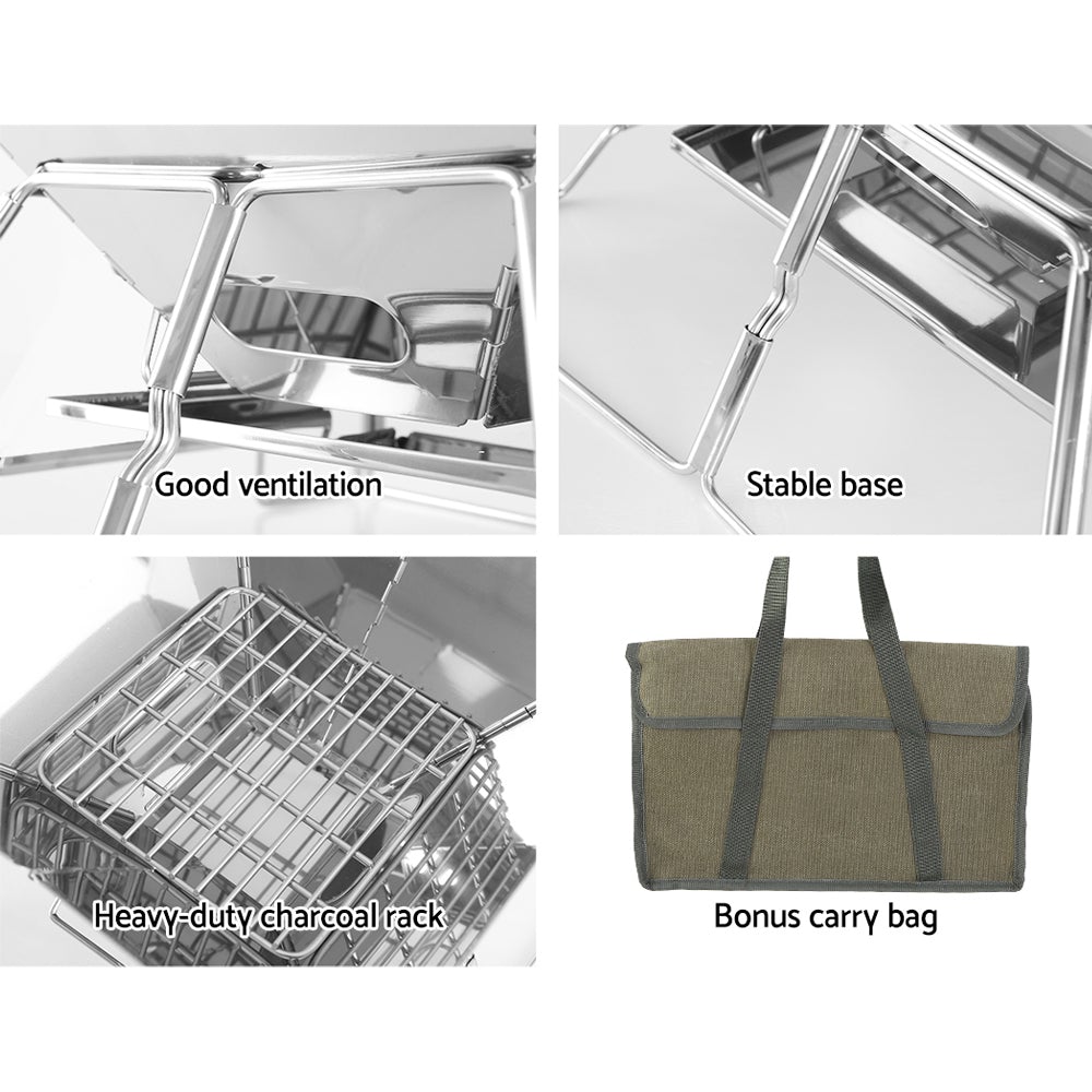 With our Grillz 2-in-1 Portable Fire Pit BBQ, you can expect some genuine all-season enjoyment all round. First, as a fire pit, it is simply great sitting around a nice warm fire with friends and family to chat the day or night away. And should you decide to up the ante and have a sumptuous BBQ instead, just load on the food for some great feastings. Both the body and grill parts are made of food-grade stainless steel, meaning they are completely safe for cooking, and strong and durable too. The base is sturdy and stable and comes with an ashtray to collect all the burnt materials. Plus, the heavy-duty charcoal bed allows charcoal or beads to be neatly placed without creating any additional mess while in use. The grill rack is height-adjustable to two levels so that you can cater to large groups and always have the perfect amount of heat for whatever is cooking. And for a consistent good fire, the fire pit BBQ is designed with ample ventilation to let air flow through easily. Best of all, it folds flat for easy storage and transportation so that you can set it up on your lawn, deck and patio or even in caravan parks and camping sites. A bonus carry bag is also included for effortless, one-handed carrying.