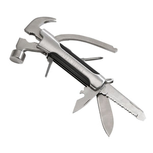 Looking for a gift that is stylish as well as functional and practical and looks great with a name or monogram? Look no further than our stainless steel hammer and multifunction tool. This tool has it all, 10 tools in 1, a hammer, pliers, 2.5" blade, 2.5" saw blade with file, flat head screwdriver, Phillips head screwdriver, bottle opener, reamer and wire cutter. 5.25" L x 3" W, includes black pouch. Black Gift Box.
