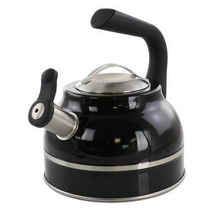 Enjoy a cozy warm beverage with this Kenmore Elite 2.3 Quart Stainless Steel Whistling Tea Kettle in black. The high quality stainless steel construction means optimal heat distribution and the glossy finish resists rust, corrosion, and oxidation so you can use it for years to come. This kettle is super easy to use, no wires or batteries just simply fill up the kettle with water and place it on any cook top surface. Listen for the whistling noise to know your water has reached the boiling point and is ready to use!