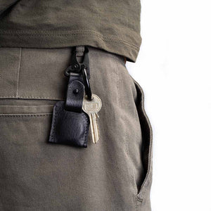 Leather AirTag keychain with carabiner and carabiner keyring handcrafted from full-grain premium Italian leather. Available with golden or silver color hardware. Available personalization and customization options.