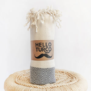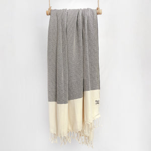 Otto Black Turkish towel has a soft silky touch. A fancy beach towel by day, shawl by night a sofa blanket or a baby blanket.
