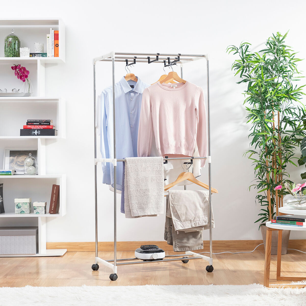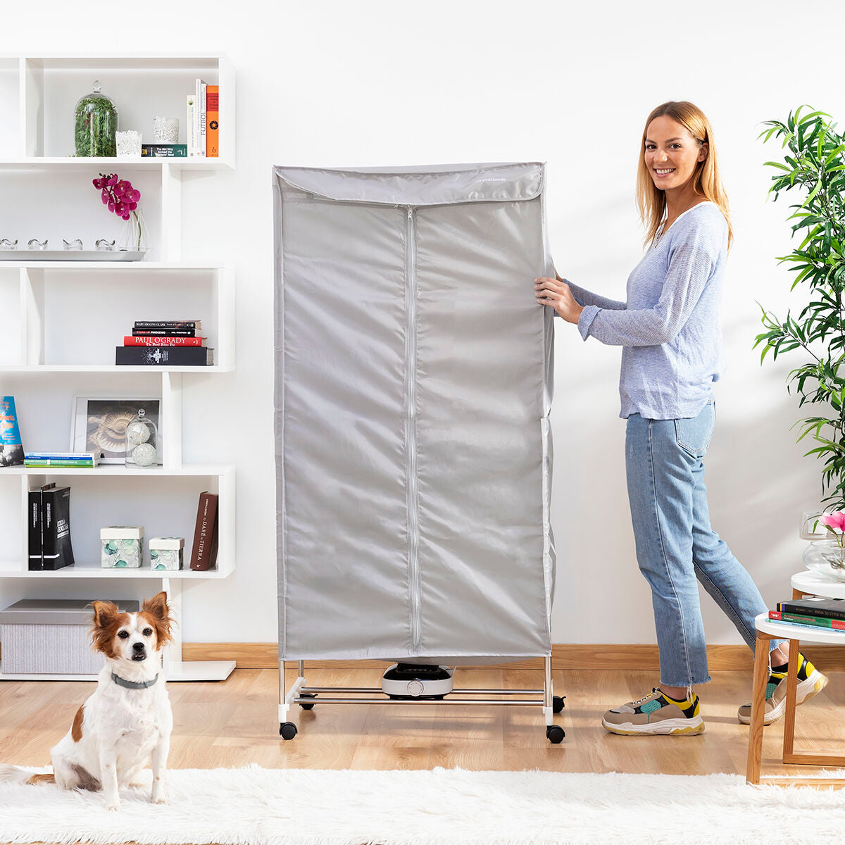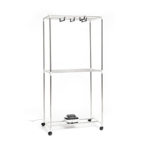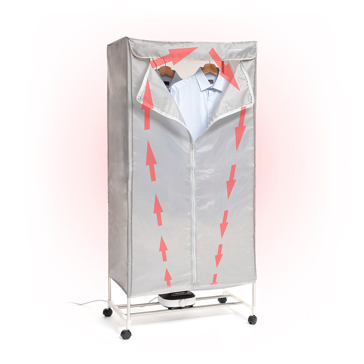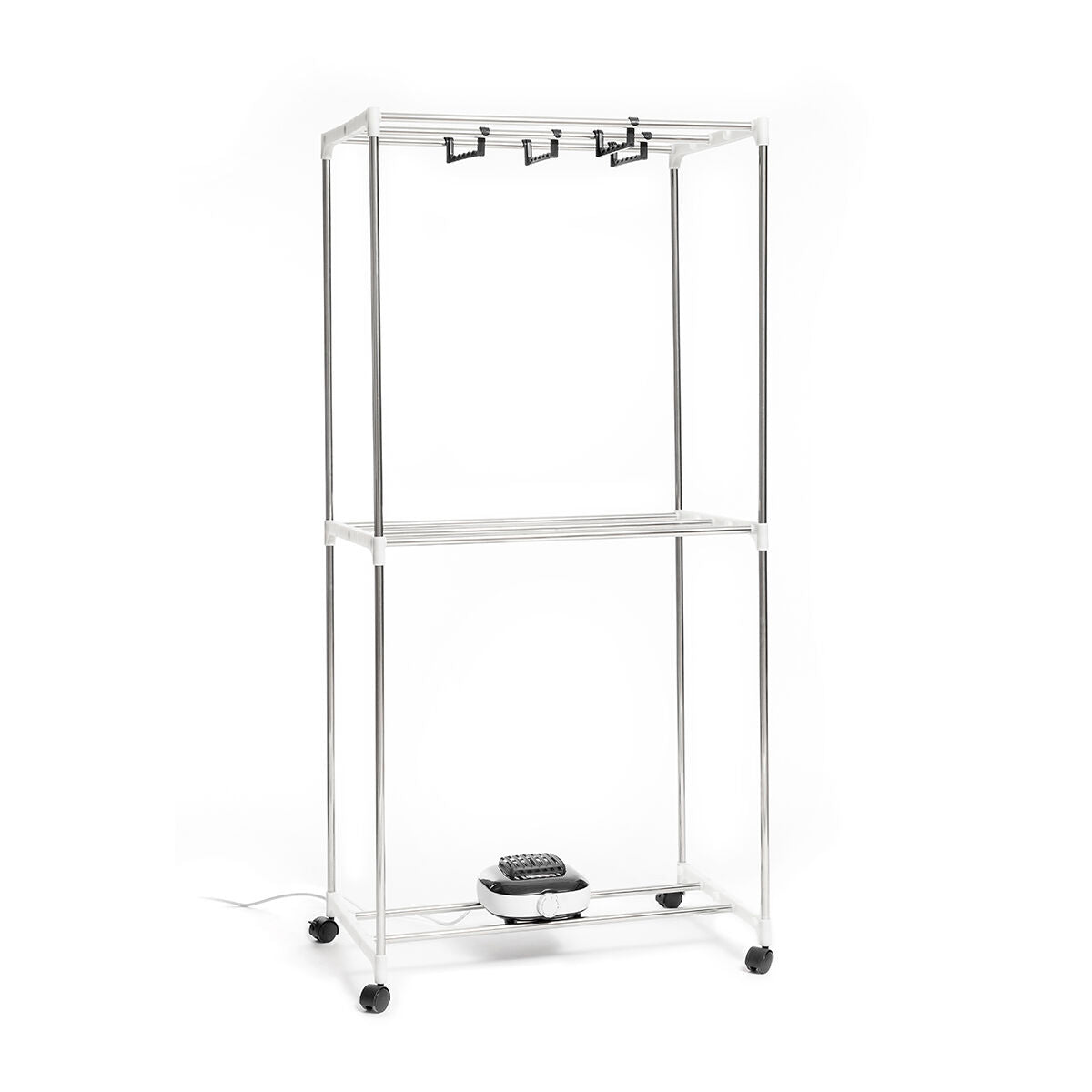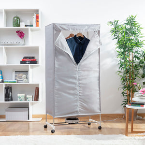 A portable electric dryer with various levels which is perfect for drying clothes more quickly and more conveniently, thereby saving time and effort. The clothes dry straight and are therefore less creased, making them easier to iron later. This dryer is very easy to use and transport anywhere as it has 4 transport wheels with 360º rotation and a safety block to provide a firm hold. Clothes can be hung in various positions (facing forward or to the side) as it includes 6 additional supports for holding clothes hangers as well as the actual bars that make up the structure. It has a large capacity and is suitable for all types of garments of all sizes. It reaches a temperature of 70 ºC which sterilises the clothes and removes odours. The external cover is removable and can be hand-washed. It features a zip closure and protects clothes from dust and any environmental dirt. The powerful air heater is silent and has a safety thermostat to prevent overheating. The timer allows the drying time to be programmed and it will then switch off automatically. It is easy to assemble and dismantle. All you need to do is follow the assembly instructions included.