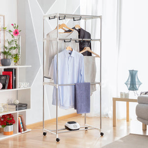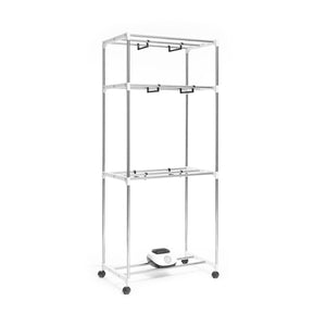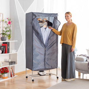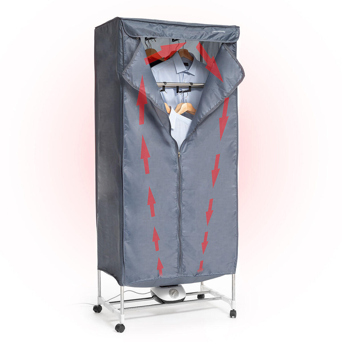 A portable electric dryer with various levels which is perfect for drying clothes more quickly and more conveniently, thereby saving time and effort. The clothes dry straight and are therefore less creased, making them easier to iron later. This dryer is very easy to use and transport anywhere as it has 4 transport wheels with 360º rotation and a safety block to provide a firm hold. Clothes can be hung in various positions (facing forward or to the side) as it includes 6 additional supports for holding clothes hangers as well as the actual bars that make up the structure. It has a large capacity and is suitable for all types of garments of all sizes. It reaches a temperature of 70 ºC which sterilises the clothes and removes odours. The external cover is removable and can be hand-washed. It features a zip closure and protects clothes from dust and any environmental dirt. The powerful air heater is silent and has a safety thermostat to prevent overheating. The timer allows the drying time to be programmed and it will then switch off automatically. It is easy to assemble and dismantle. All you need to do is follow the assembly instructions included.
