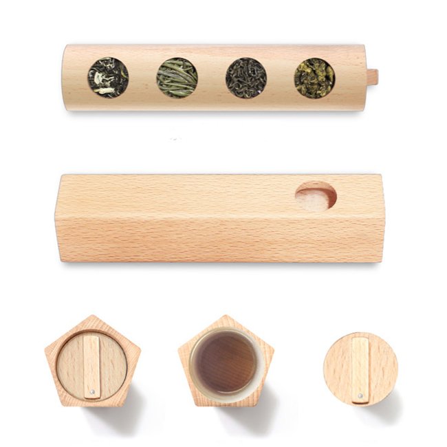 The box is pentagon,there are four sides have holes,there are four cells insides,and each cell could put about 5g tea,you could put different tastes of teas inside.The tea is enough for your three days travel.