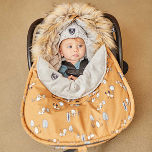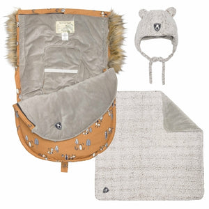 Make car rides comfy and cozy on a cold day with our Yellow Printed Woodland Animals Baby Pouch With Assorted Accessories. This three-piece set includes an insulated, water-repellent pouch with a convertible hood featuring a removable faux fur trim and a completely removable bottom for secure installation of straps directly to baby's body in the car seat. It's fully lined and comes with a sherpa earflap hat and a comfy sherpa blanket for added warmth.