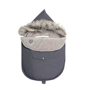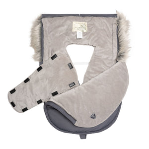 Make car rides comfy and cozy on a cold day with our Solid Grey Baby Pouch With Assorted Accessories. This three-piece set includes an insulated, water-repellent pouch with a convertible hood featuring a removable faux fur trim and a completely removable bottom for secure installation of straps directly to baby's body in the car seat. It's fully lined and comes with a sherpa earflap hat and a comfy sherpa blanket for added warmth.