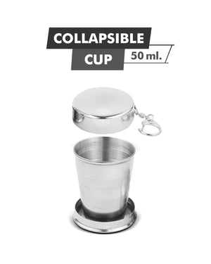 Stainless Steel Collapsible Metal Cup This stainless steel folding travel cup has a 50ml capacity which is big enough to quench most any one's thirst with just a few drinks! This cup collapses flat for easy carrying and storage. Each cup is made from high quality, food grade, stainless steel which is great for safe drinking. Perfect for backpacking, camping, tailgating, shopping and much more! Our metal cups are made in a way that when the cup is open the rings fit snugly together making this collapsible steel cup leek-proof! Features a belt loop clasp and individually packed in plain black cardboard box. 1 year warranty against defects.