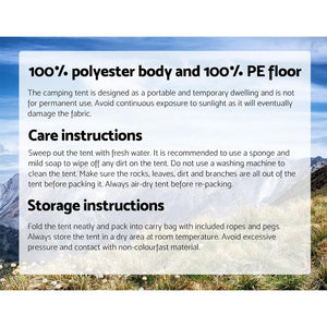 Now you can spend less time setting up the tent and more time relaxing or exploring the outdoors when you go camping with our Weisshorn 5-person Pop-Up Tent. Both the setting up and packing away of the tent is easy and can be done by a single person. In fact, it takes less than a minute to set up the tent 鈥?just throw it into an open area and watch it pop up instantly. The tent is made of high-quality heavy-duty 190T polyester material with PU coating to keep rain and UV rays at bay efficiently and effectively. The steel poles are durable and super strong to keep your tent sturdy and firm. To enable ample light and ventilation within the tent, mesh windows are featured while the oversized entrance is easily opened and closed with a handy zipper. Step inside and five persons will appreciate the generous space that welcomes them. So take that road trip to the hills or have that wonderful outdoor family picnic with total peace of mind as you load up the pop-up tent with its handy carry bag into your vehicle. Happy trails!
